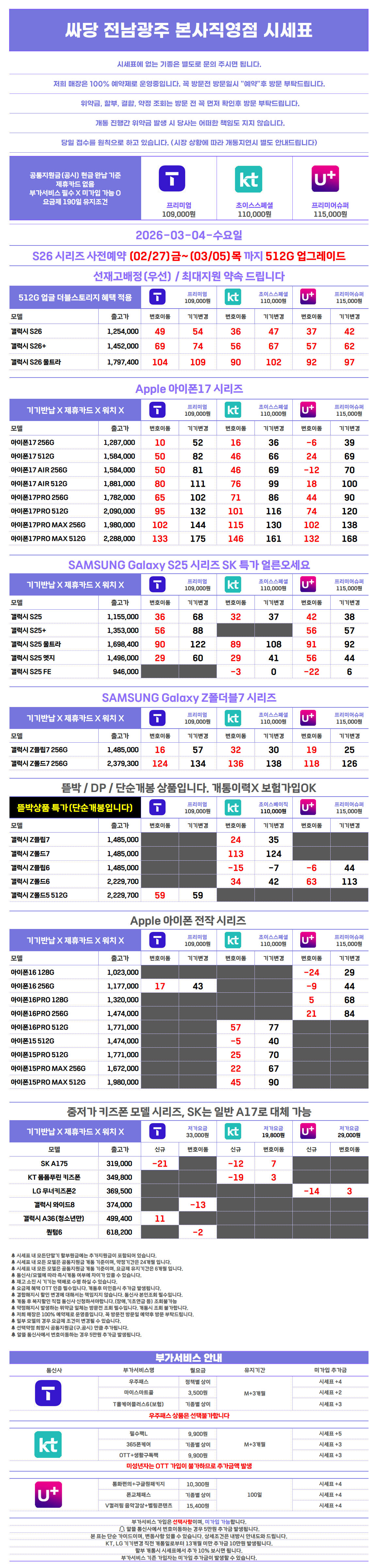 해당 시세표는 부가서비스 조건을