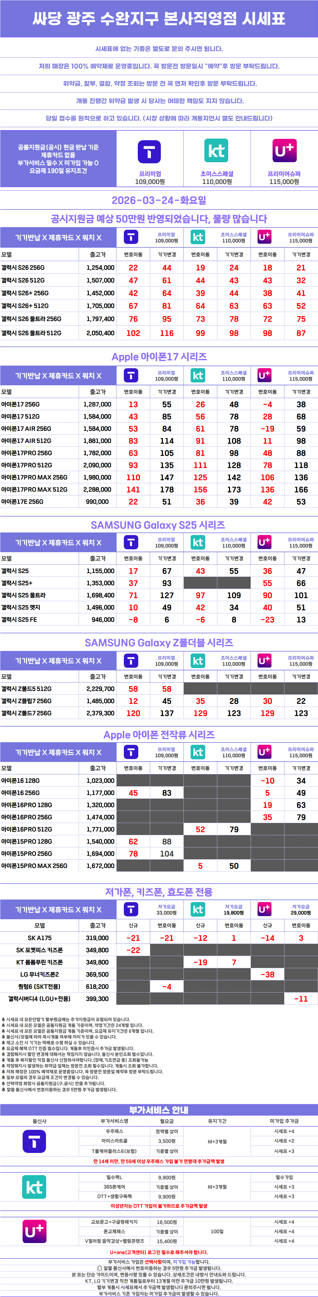 해당 시세표는 부가서비스 조건을