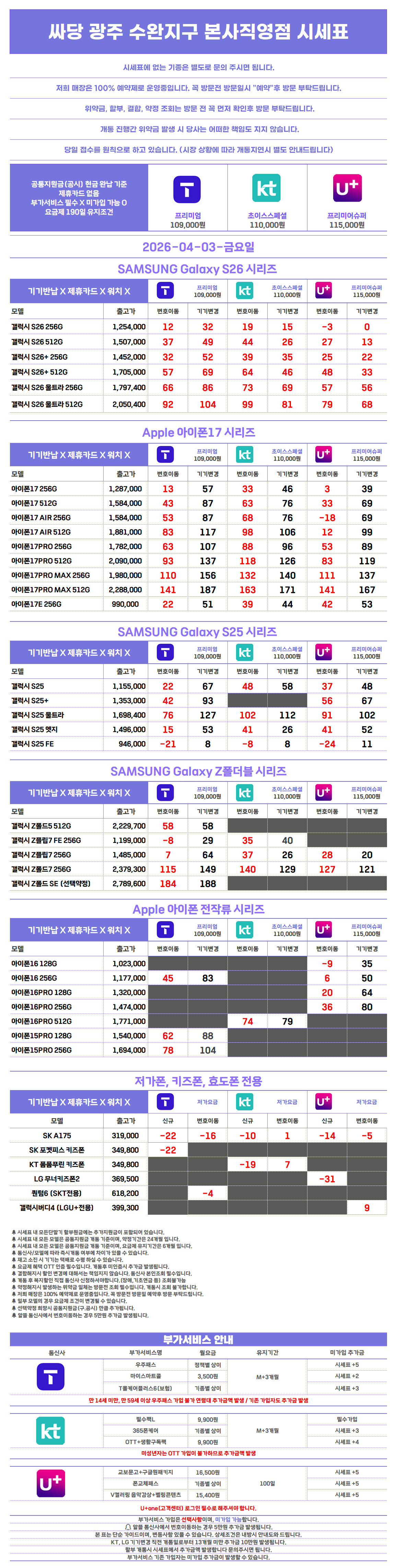 해당 시세표는 부가서비스 조건을