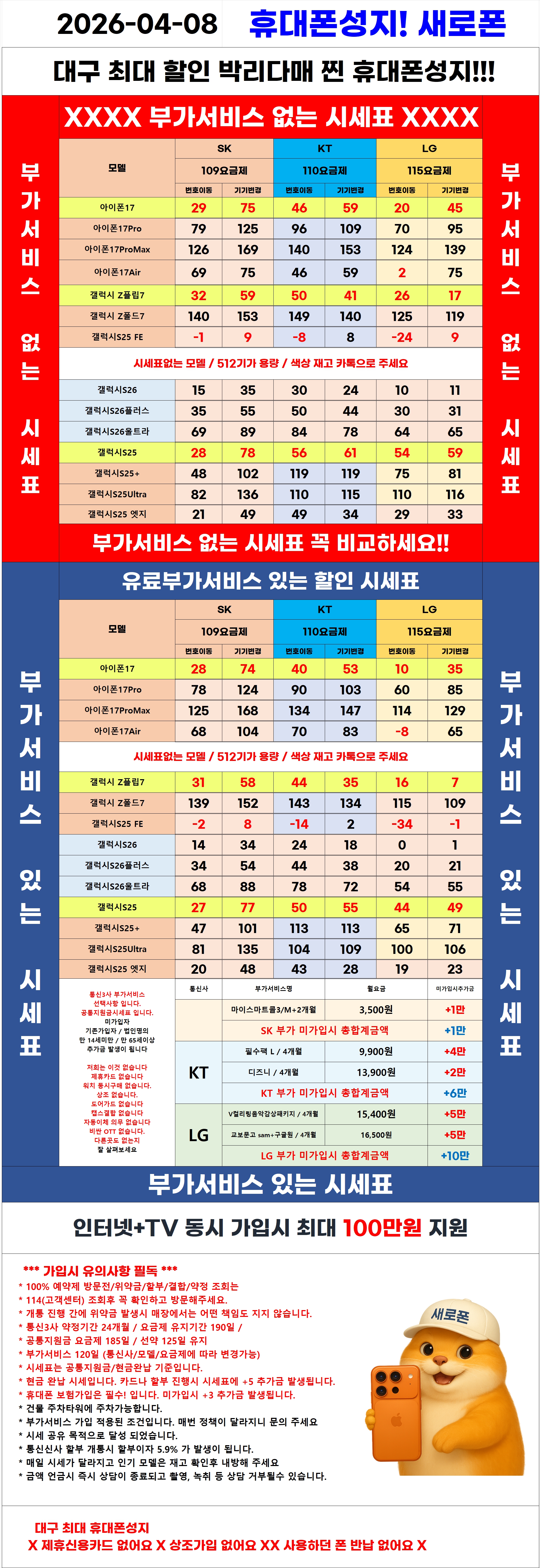 본 업체는 불법보조금을 지원하지 않습니다 시세표에 최대 지원금 (공시,추가,전환지원금) 및 인터넷+TV 결합 지원금+제휴카드 금액이 포함되어 있습니다