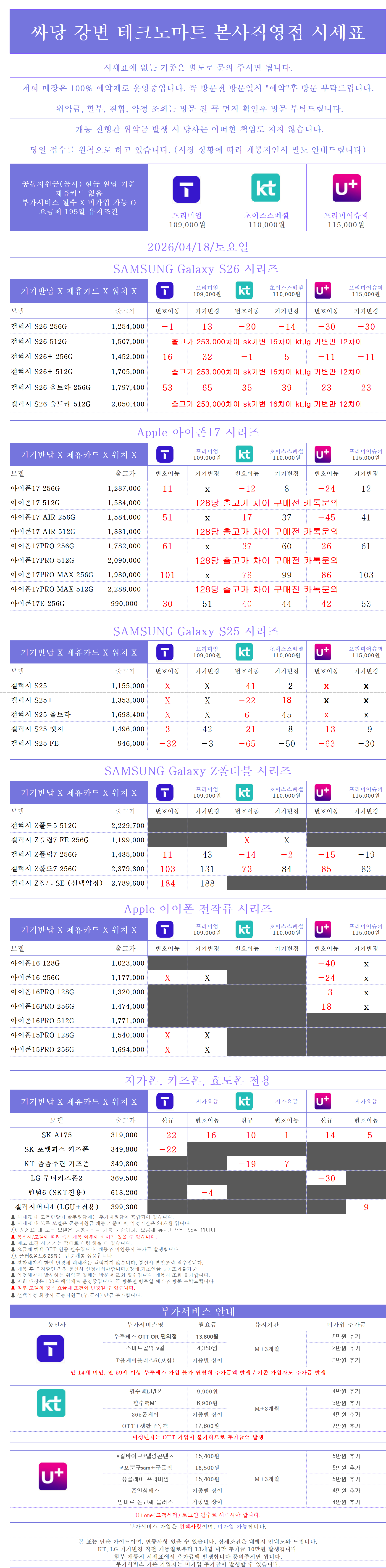 순수 요금제 , 부가서비스만 들어간 시세표 입니다