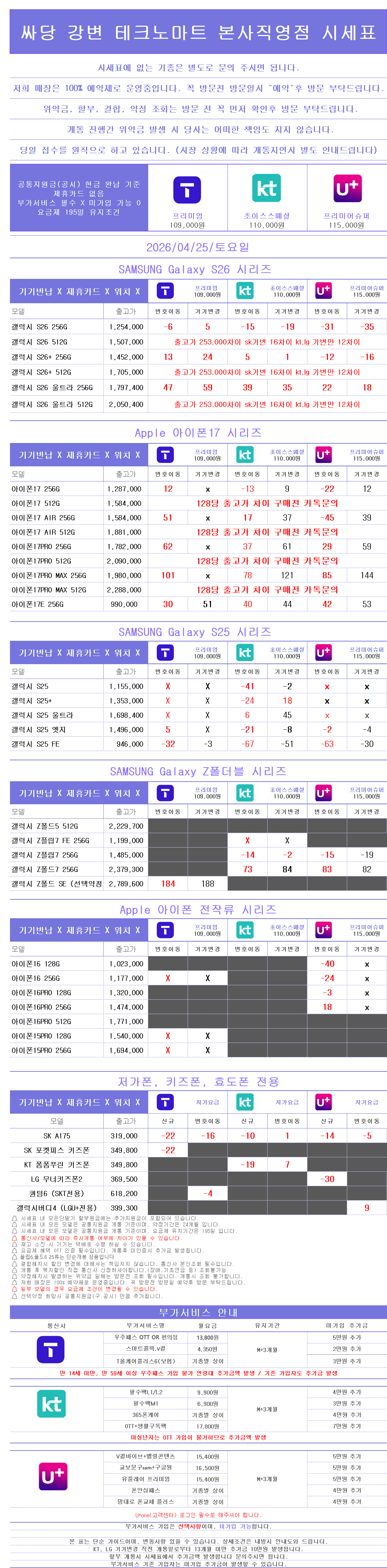 ✅아래 시세표는 공통(공시)지원금, 유통망지원금 등 이 포함된