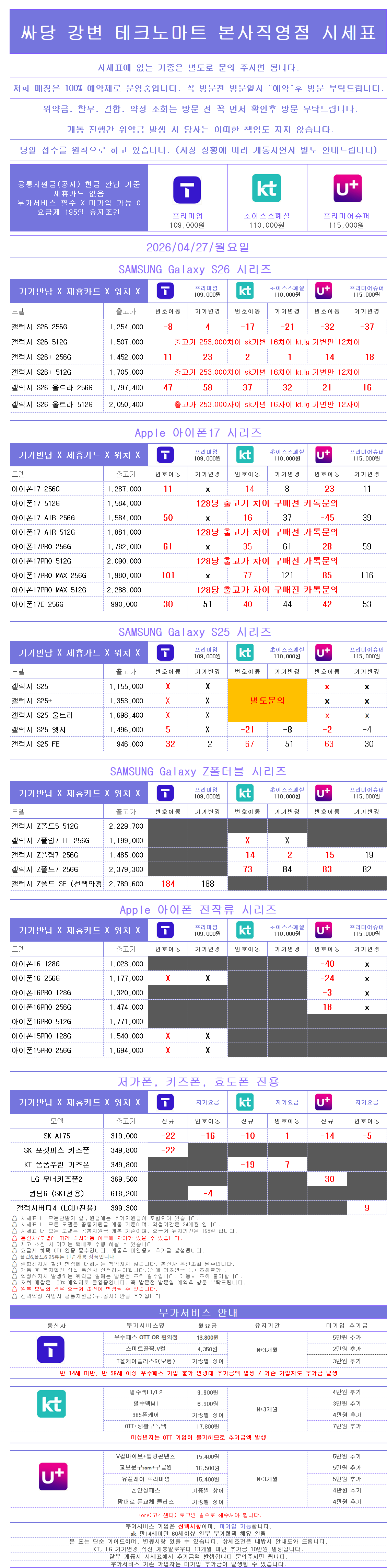순수 요금제 , 부가서비스만 들어간 시세표 입니다