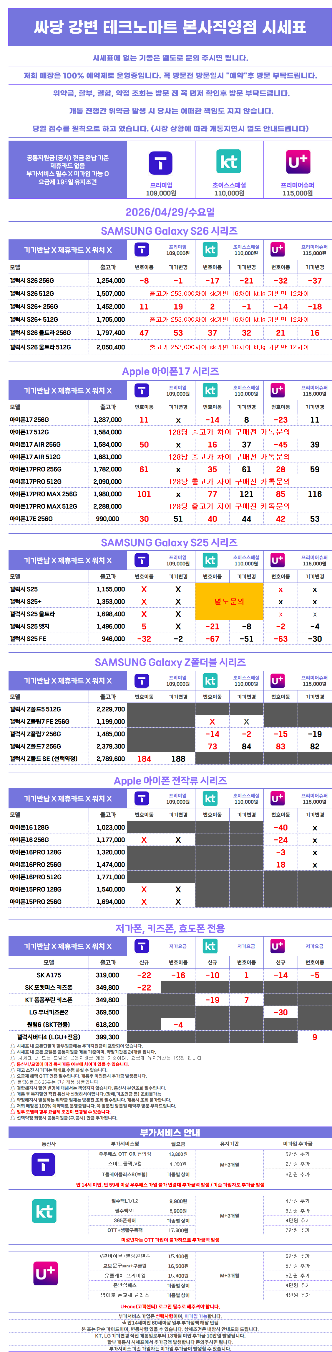 순수 요금제 , 부가서비스만 들어간 시세표 입니다
