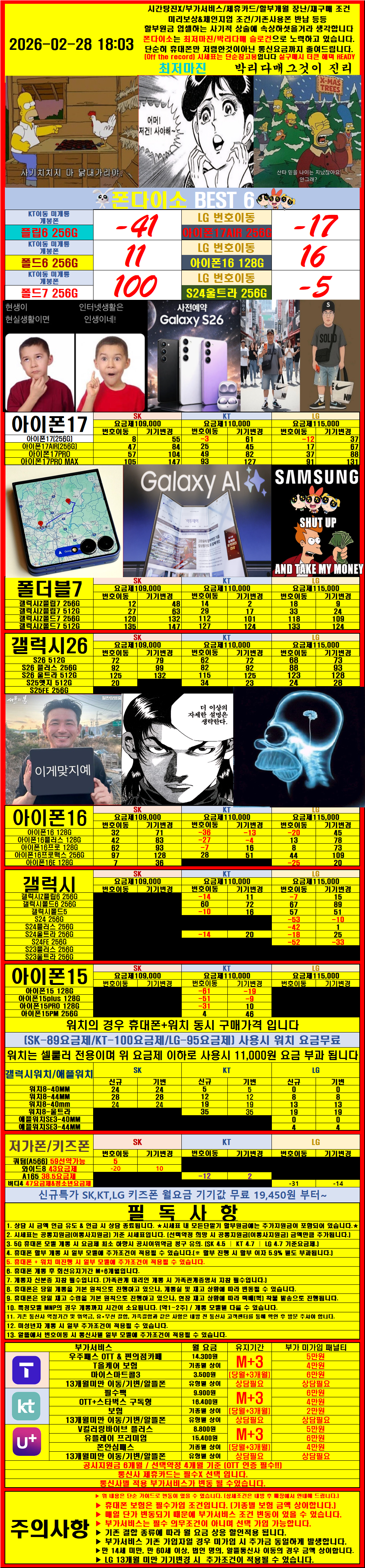 📢 시세표 안내: 최대 지원금(공시·추가·전환지원금) 및 워치개통+ 제휴카드(세이브카드X)청구형 카드 단순 자동이체 혜택이 모두 포함되어 있습니다. 💼