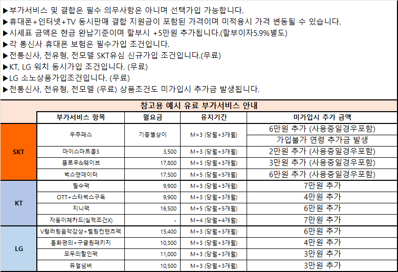 | 통신사 | 부가서비스명(유지기간) | 월요금 | 미가입 시 추가금 |