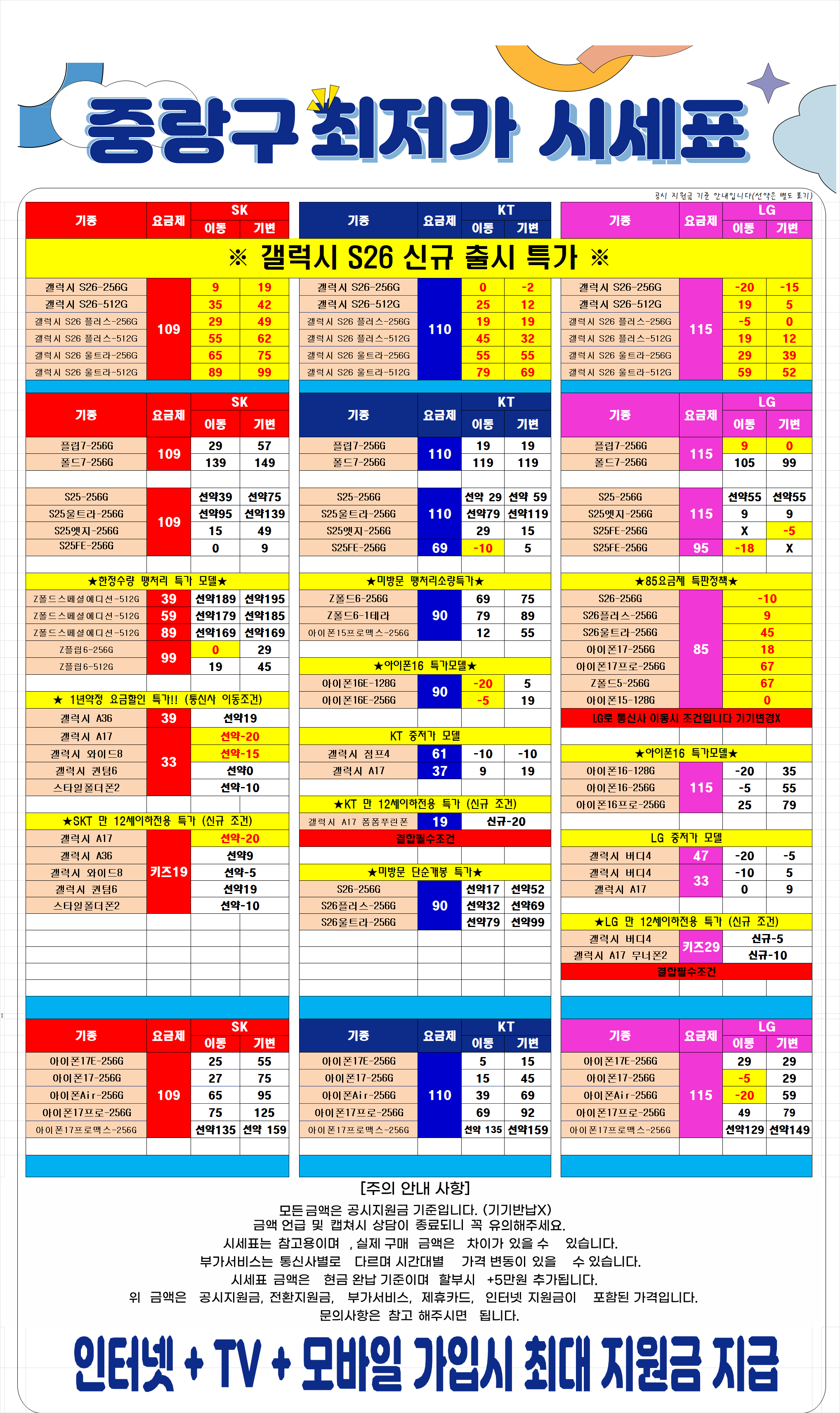 시세표에는 최대 지원금(공통지원금&이통사지원금, 추가지원금&유통망지원금)