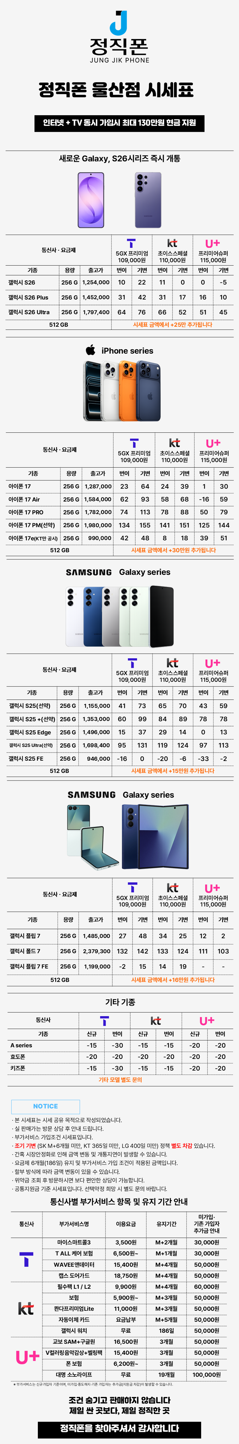 [울산 남구 시세표] 울산 전지역 S26즉시개통 전모델 최저가 시세표