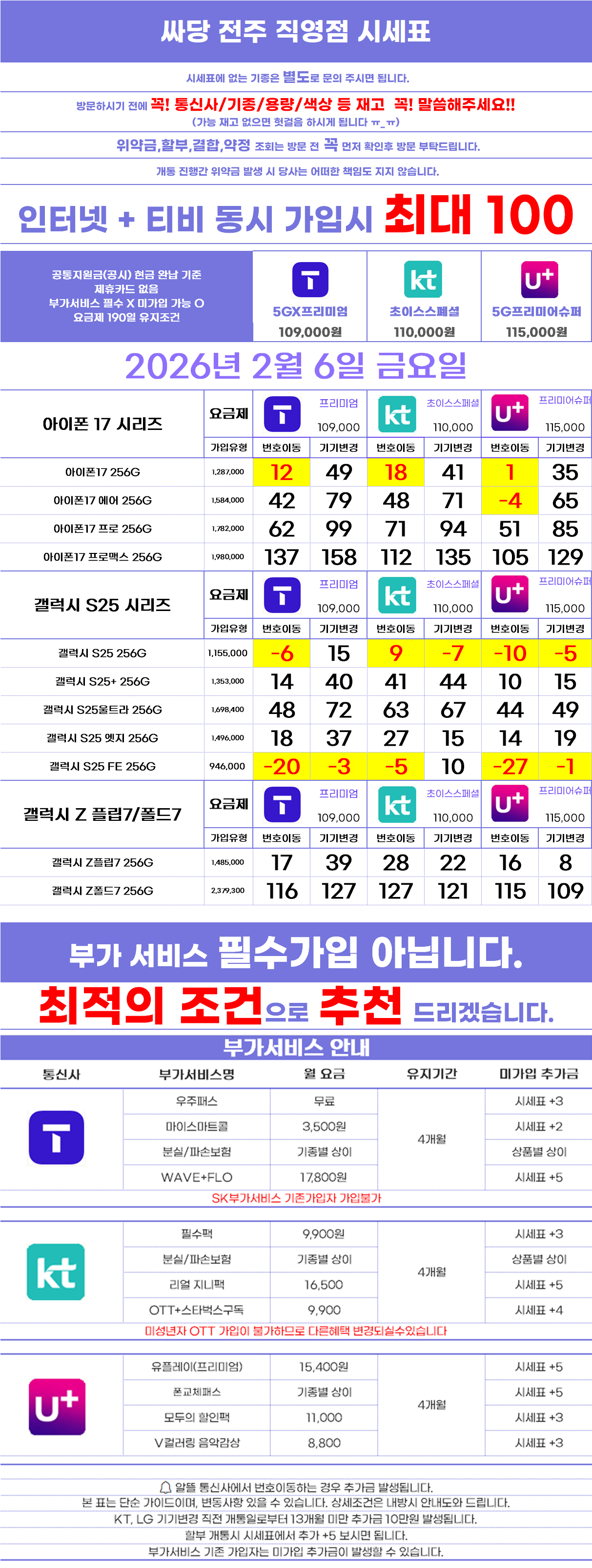 본 업체는 불법보조금을 지원하지 않습니다 시세표에 최대 지원금 (공시,추가,전환지원금) 및 인터넷+TV 결합 지원금+제휴카드 금액이 포함되어 있습니다