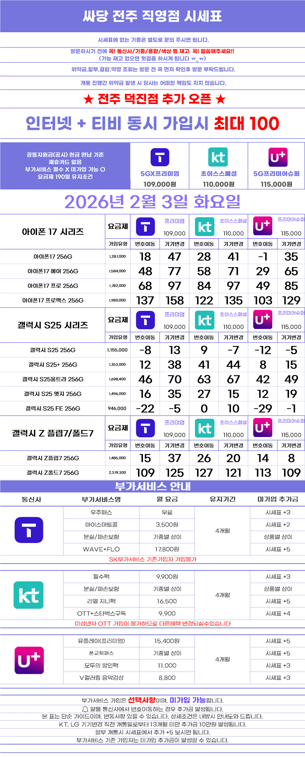 본 업체는 불법보조금을 지원하지 않습니다 시세표에 최대 지원금 (공시,추가,전환지원금) 및 인터넷+TV 결합 지원금+제휴카드 금액이 포함되어 있습니다
