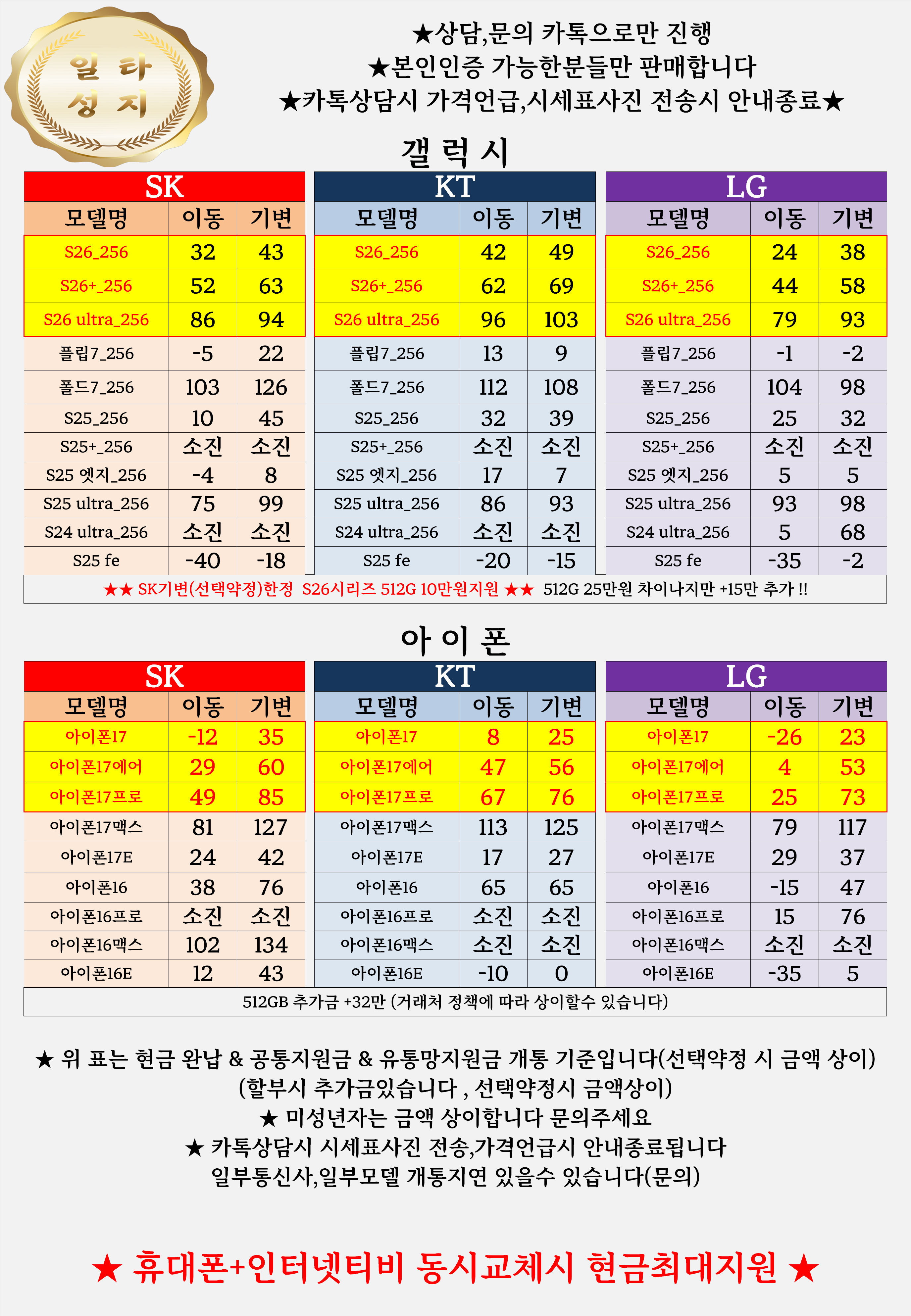 ⚠본 업체는 불법보조금을 지원하지 않습니다 시세표에 최대 지원금 (공시,추가,전환지원금) 및 인터넷+TV 결합 지원금+제휴카드 금액이 포함되어 있습니다.