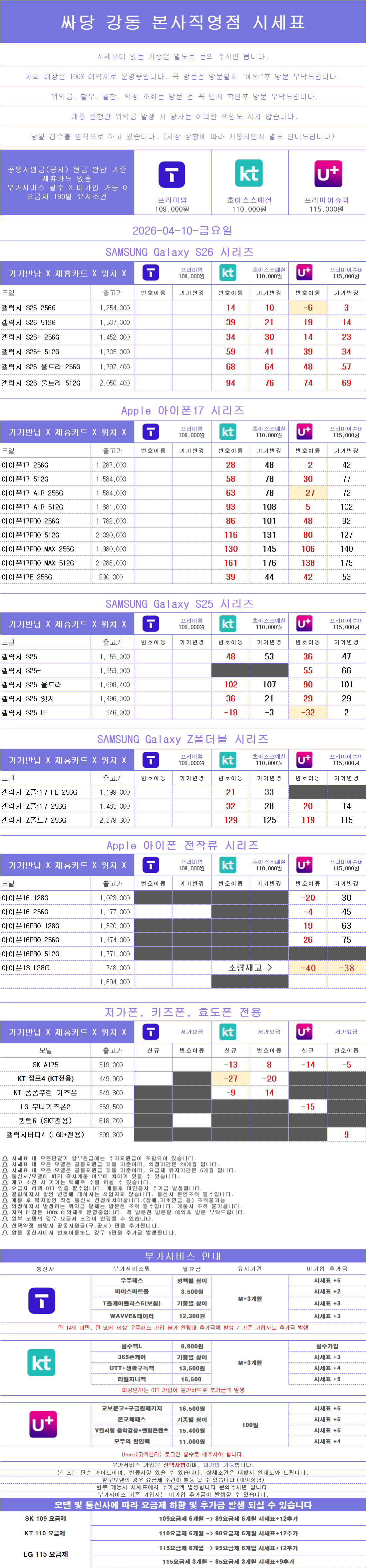 [서울 강동구 시세표] 휴대폰 성지 싸당 강동점 0410 시세표