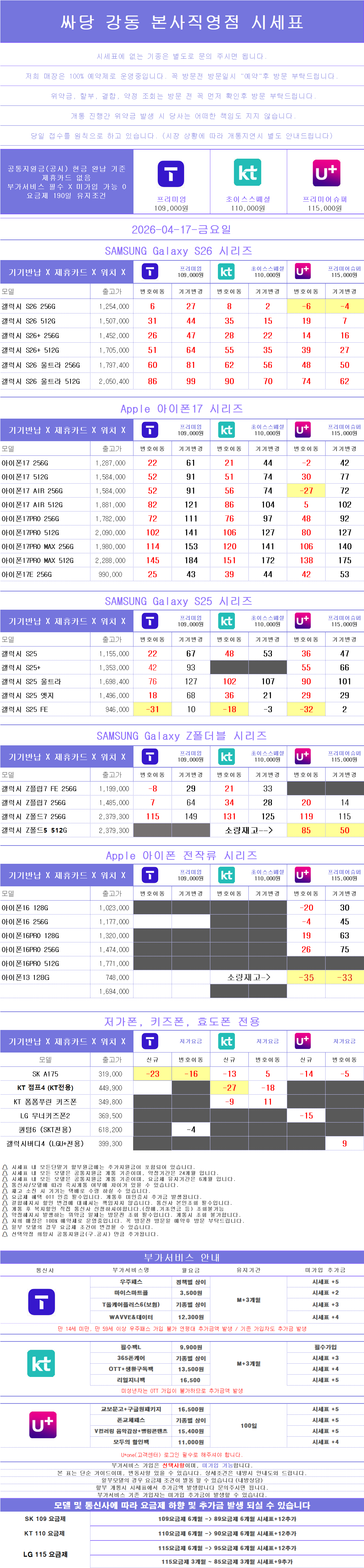 [서울 강동구 시세표] 휴대폰 성지 싸당 강동점 0417 시세표