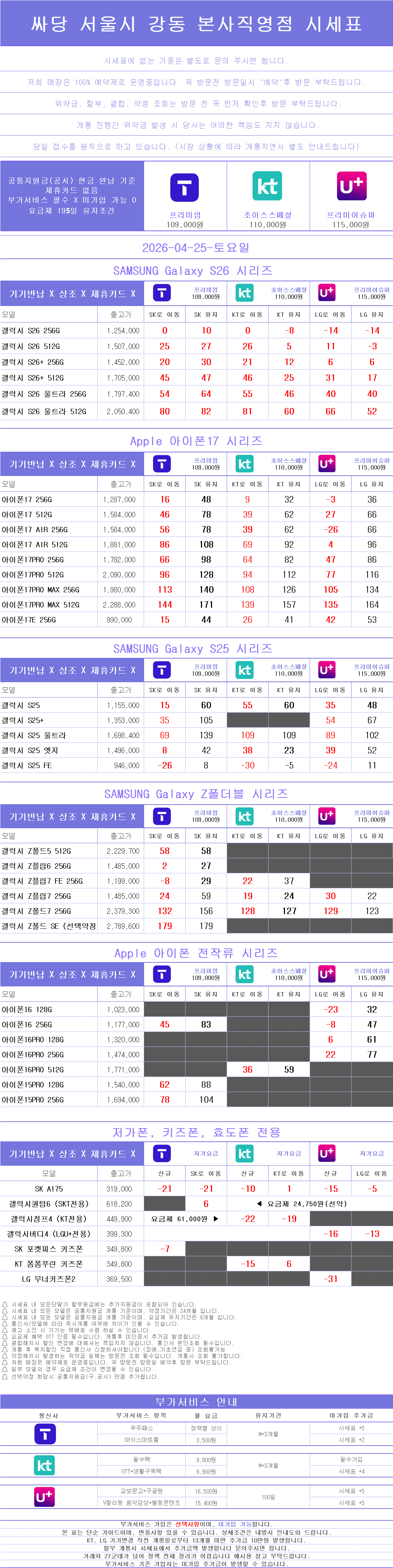 [서울 강동구 시세표] 휴대폰 성지 싸당 강동점 0425 시세표
