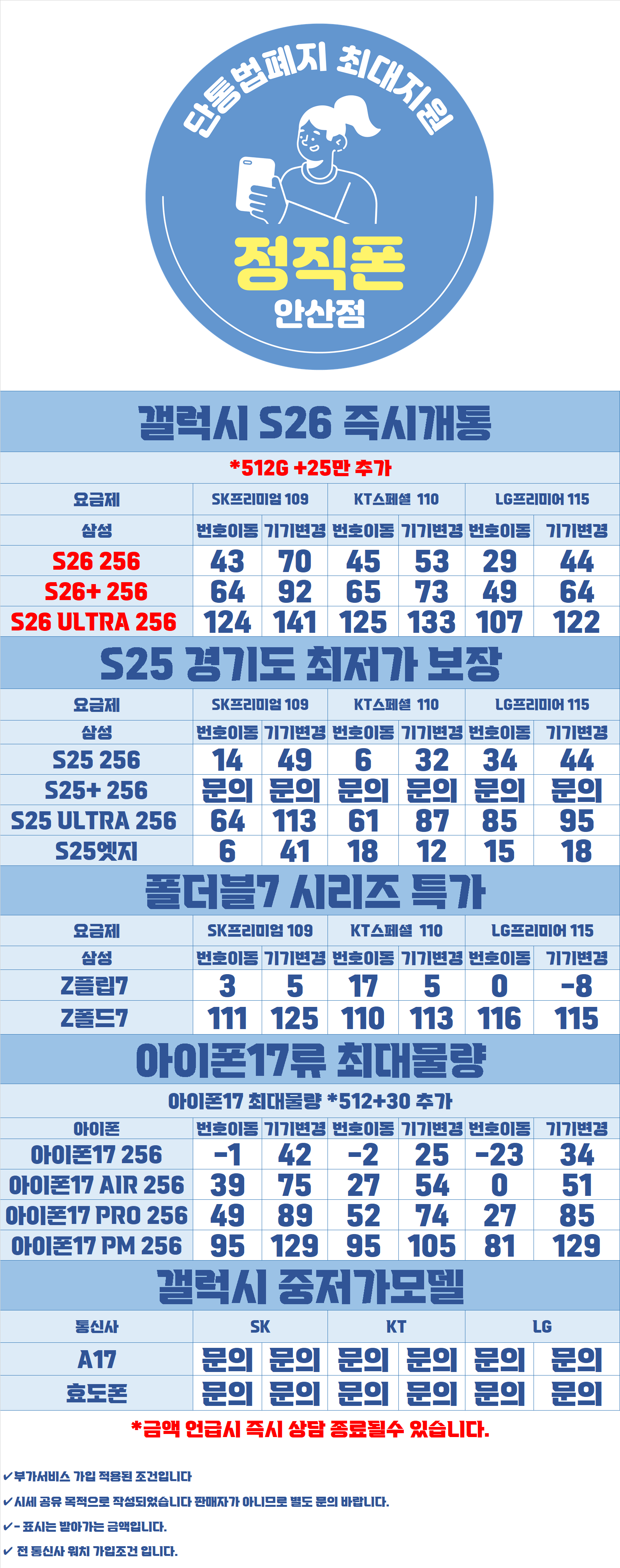 [경기 안산시 시세표] 3월특판 안산 최저가 보장매장 S26최대물량보유,